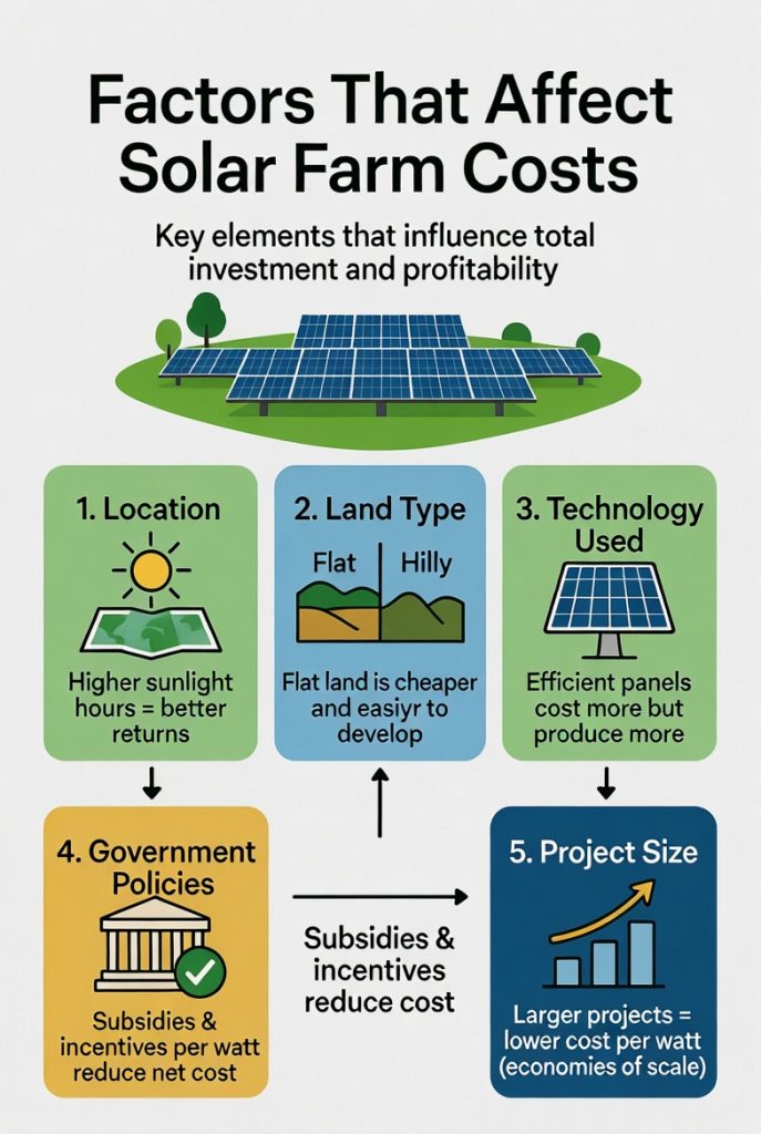 Several key factors can significantly increase or decrease the total investment required for a solar farm. Understanding these can help you make smarter decisions and optimize your budget.